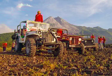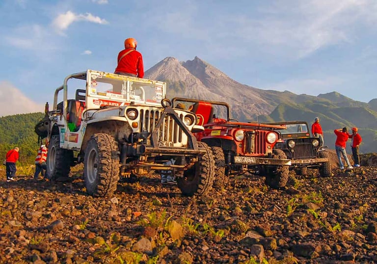 Rasakan andrenaline dengan jeep lava tour di dasar Gunung Merapi.